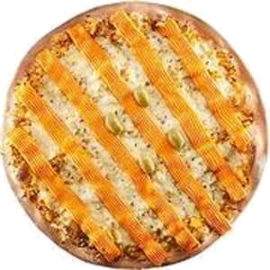 PIZZA STROGONOFF DE FRANGO (P)Ingredientes: File de Frango, Creme de Leite, Milho, Palmito, Azeitona, Mussarela, Oregano e Batata Palha.(P) R$ 45,00