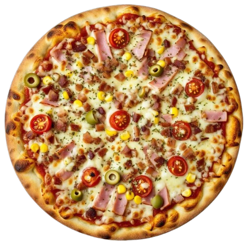 PIZZA BACON (P)Ingredientes: Presunto, Tomate, Milho, Mussarela, Bacon, Oregano e Azeitona.(P) R$ 40,00